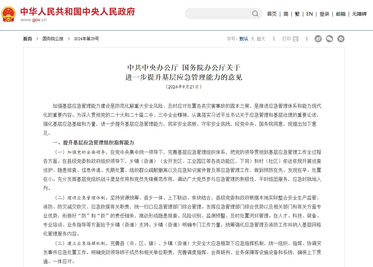中共中央办公厅 国务院办公厅关于进一步提升基层应急管理能力的意见(2024年9月21日) 加强基层应急管理能力建设是防范化解重大安全风险、及时应对处置各类灾害事故的固本之策,是推进应急管理体系和能力现代化的重要内容。为深入贯彻党的二十大和二十届二中、三中全会精神,认真落实习近平总书记关于应急管理和基层治理的重要论述,强化基层应急基础和力量,进一步提升基层应急管理能力,筑牢安全底...